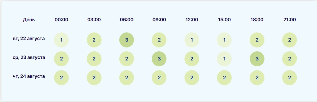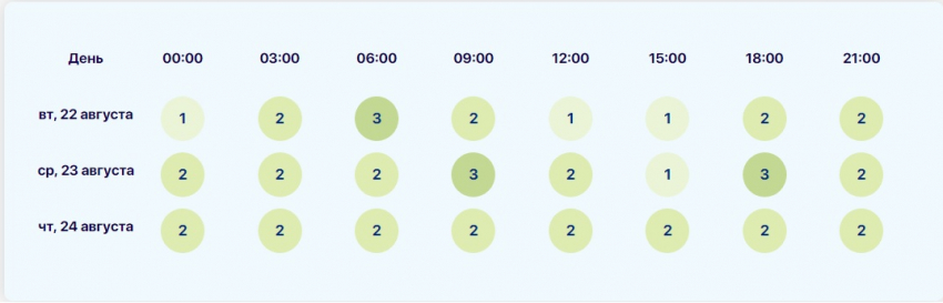 Стоит отметить, что источники по-разному оценивают интервалы возмущений, вызванных солнечными вспышками. Так, my-calend.ru прогнозирует пики с 03:00 до 06:00 и 12:00 – 15:00 по мск. В этот период ожидается активность в 3 балла. В остальные часы 23 августа возмущения будут на уровне до 2 баллов, включая спад до 1 балла с 09:00 до 12:00.