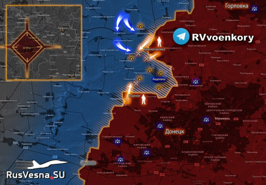 ВС РФ продолжает давить противника в районе населенных пунктов Северное и Первомайское. У Авдеевского коксохимзавода российские войска продолжают атаки, стремясь закрепиться на окраинах.