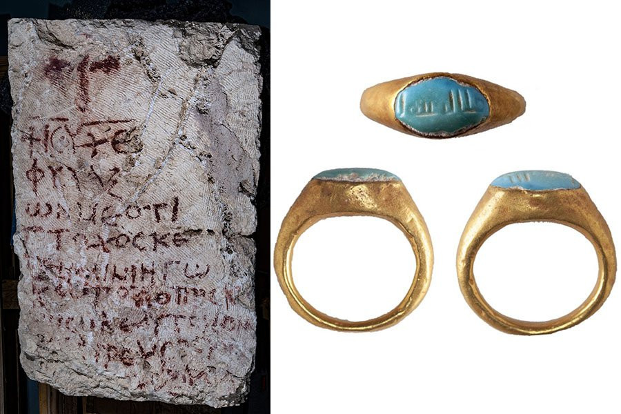 Кроме того, на месте было найдено детское золотое кольцо диаметром чуть более 1 см, украшенное камнем из бирюзы. Особый характер находке придает миниатюрная надпись, высеченная на камне арабским куфическим письмом. Доктор Ницан Амитай-Прейсс, эксперт по ранней арабской эпиграфике в Еврейском университете, смог расшифровать надпись как «مَا شَاءَ ٱللَّٰهُ» (Машаллах), что переводится как «Так пожелал Бог». Она относит этот стиль письма ко времени халифата Омейядов, который правил в VII и VIII веках нашей эры. Доктор Амитай-Прейсс также заметил в надписи уникальную особенность: два из трех слов были зеркальными отражениями, что убедительно свидетельствует о том, что кольцо, возможно, изначально служило печатью.