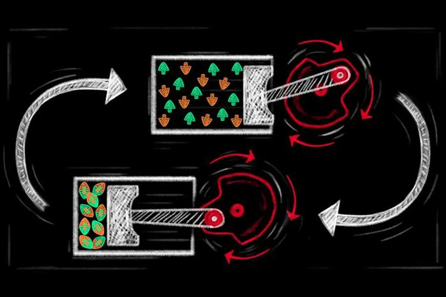 На схематическом изображении двигатель использует термодинамические изменения для производства работы. Например, когда газ воспламеняется, он расширяется и толкает поршень. Теперь исследователям удалось разработать аналогичный двигатель, но вместо использования взаимосвязи между температурой, давлением и объемом новое устройство использует квантовую механику. Исследование опубликовано в журнале Nature.