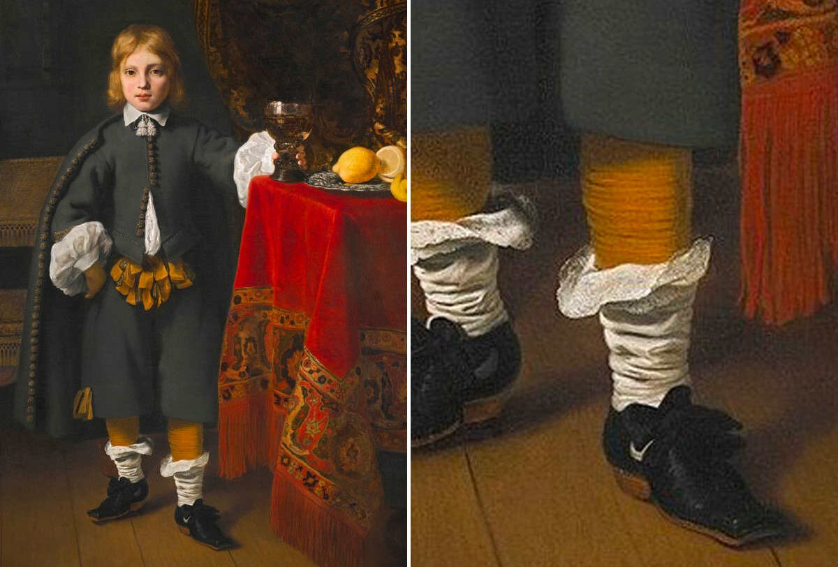 В одежде мальчика внимание любителей искусства привлекла обувь мальчика, на которой внимательные посетители заметили белый значок, очень похожий на логотип Nike.